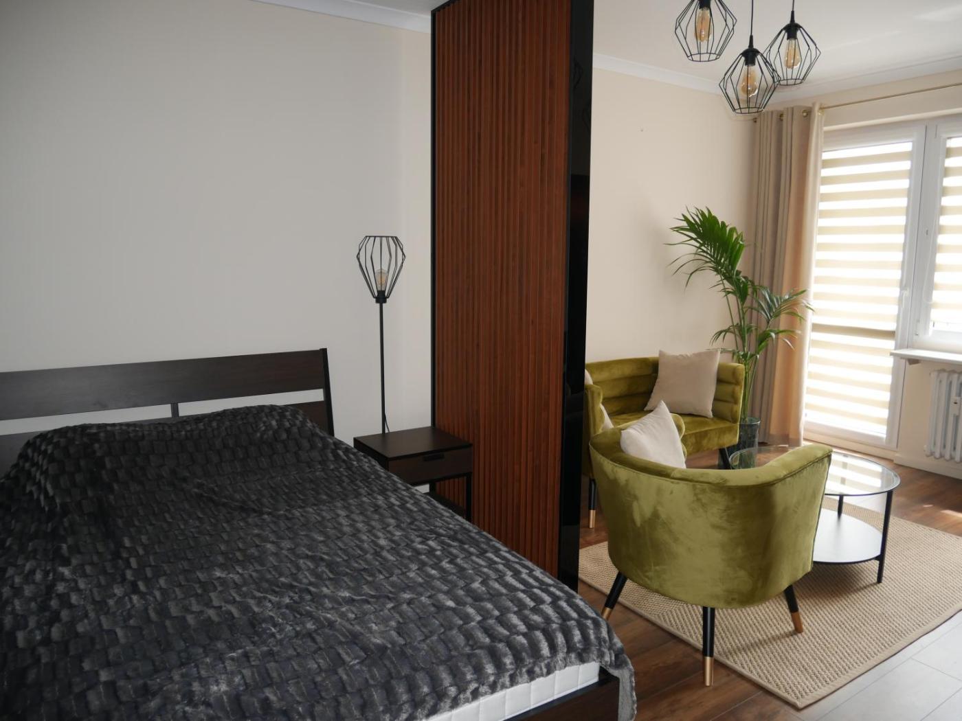 Apartament z 1 sypialnią. This apartment has a balcony, kitchen and washing machine. This apartment is located on the third floor of a residential building. Apartament - 2 osobowy. Powierzchnia pokoju ok.: 43 mkw.