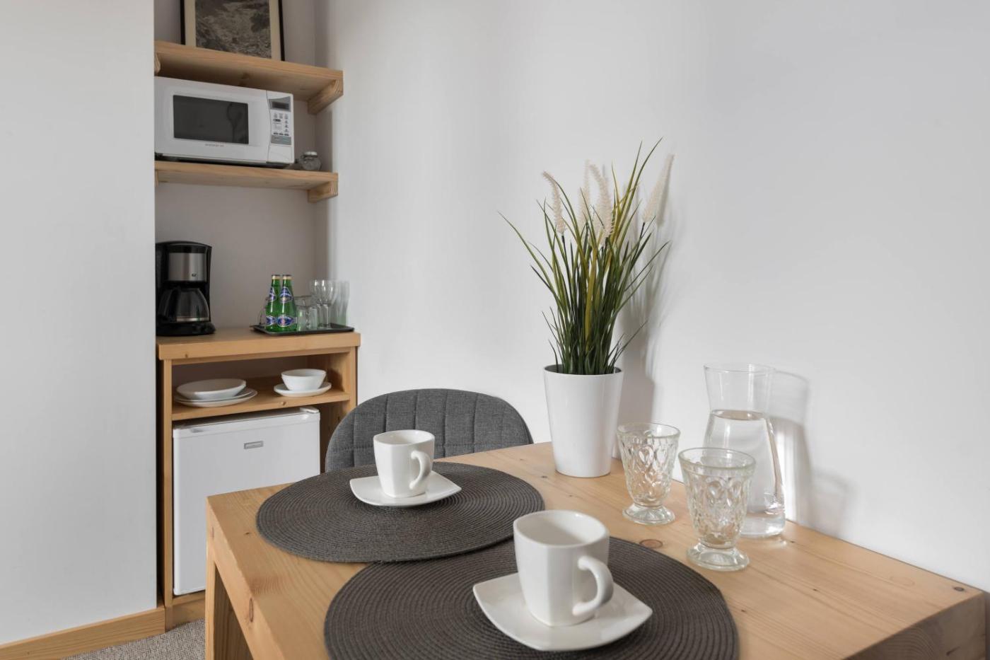 Studio. The studio features a seating area, a dining area, as well as a private bathroom featuring a shower and a hairdryer. The kitchenette is equipped with a stovetop, a refrigerator and kitchenware. The studio provides a flat-screen TV with satellite channels, a private entrance, soundproof walls, a tea and coffee maker as well as garden views. The unit offers 1 bed. Studio - 2 osobowy. Powierzchnia pokoju ok.: 30 mkw.